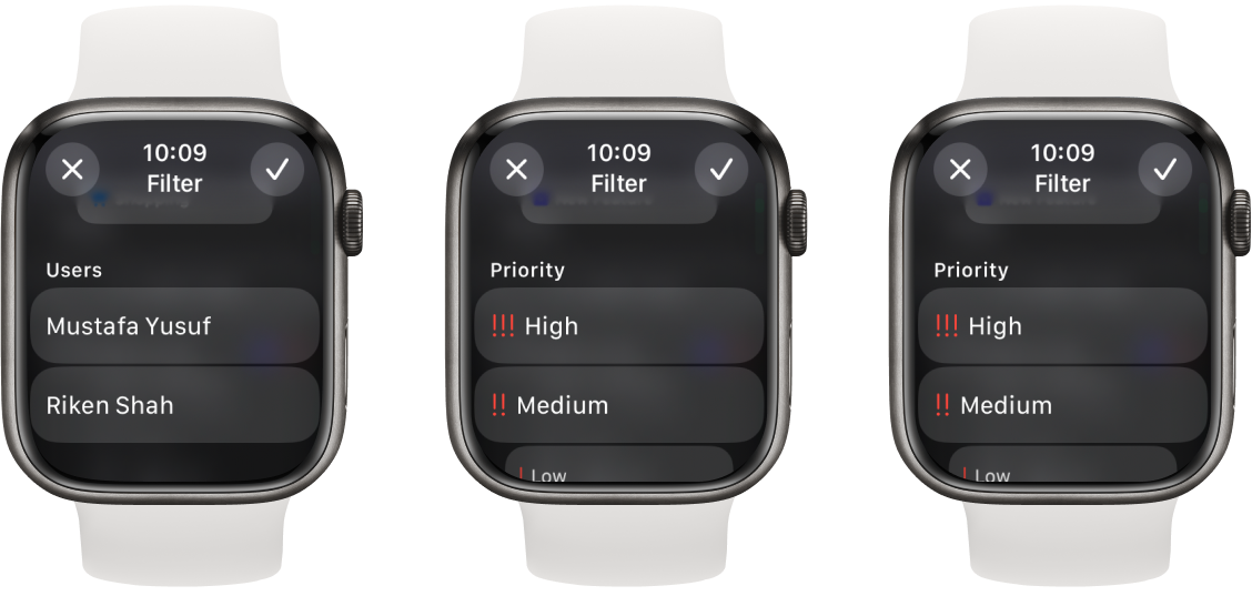 Finding tasks on the Watch can be hard because you can only see so much at a time. You can tap the Filter icon on the top right and quickly filter out your tasks from that project to get just the things you need. For example, you are at your local grocery store and use the tag #groceries. You can quickly filter the list with that tag and see just the tasks you need to.